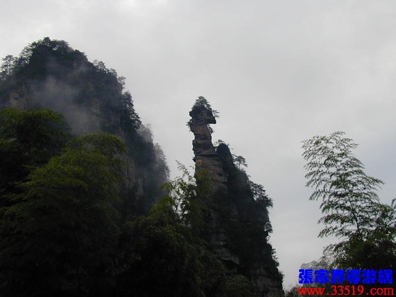 (南天門)(前行20米)現(xiàn)請大家抑頭望,可見一洞門,此門高約30米、寬4米左右,由游道兩側的兩座石峰斜傾拱峙而成。門右邊不遠處一峰高約20米,峰頂如人頭,有臉有面,似把門將軍。