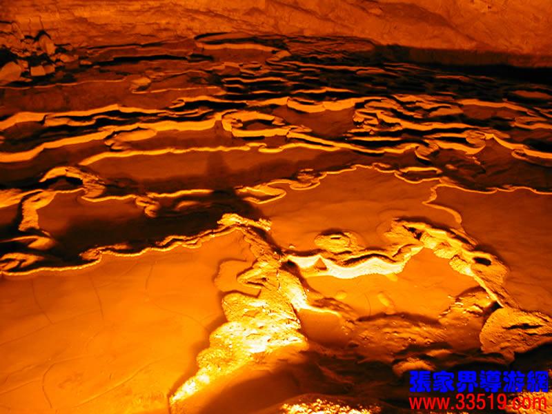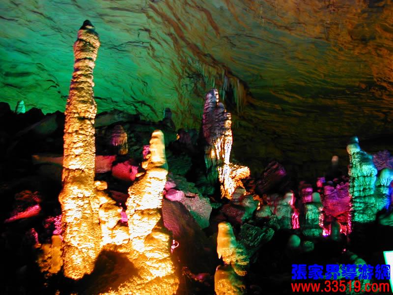 (龍宮)龍宮是黃龍洞十三個大廳中最大的一個,也是景色最美的景點之一,底面積15000平方米,平均高40米,兩千余根石筍拔地而起,千姿百態(tài),異彩紛呈,或如飛禽走獸,或如宮廷珍藏,有的像巍巍雪松,有的像火箭升空。龍宮后園有金銀兩座花池,清水常溢,花簇盛開。宮頂鐘乳柳垂簾掛,四周壁畫栩栩如生。溶解著各色各樣的礦物質(zhì)的水,從巖層中滲透出來,滴落下來。礦物質(zhì)在洞頂凝固結(jié)晶成倒懸鐘乳石,從鐘乳石滴落的水又把礦物質(zhì)澆疊、堆壘在洞底,而長成節(jié)節(jié)向上的石筍。大家看看這龍宮的造型,領(lǐng)略這磅礴的氣勢。洞內(nèi)最大石筍,高12米、直徑10米的漢白玉天然石椅“龍王寶座”居高臨下,眾多石柱石筍似人似物,維妙維肖,圍著寶座朝拜山呼,幾十座珊瑚亭亭玉立,儼然一支龐大的“宮廷樂隊”。湖南著名教授羊春秋先生作《寄生草》詞對此進行描繪:“百態(tài)千姿模樣,三宮六院門巷。龍王開宴設瓊漿,猴王偷果鬧天堂,君王納寵擁羅帳。搬演了人間爭攘,匯集了天下奇觀。”