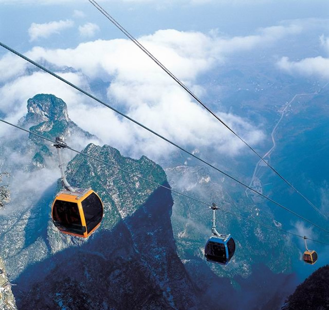 ②、張家界天門山索道為全世界最長的觀光客運索道,索道線路斜長7455 米,索道運行速度為每秒 6 米,單程運行時間約28分鐘。上、下站水平高差1279米主要設備均由法國POMA公司原裝進口,索道鋼繩來自于法國, 98 個吊廂來自瑞士 CWA 公司,單個造價高達 20 萬元人民幣。有嚴重心臟病或恐高癥等患者不建議乘坐;