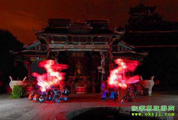 第三站:擺手場上圖騰柱的講解、土家族風(fēng)情表演及客人參與的互動節(jié)目,讓您在歡快的擺手舞中陶醉。(其中每天上午十點、下午四點準時推出土家族百人大祭祖活動;