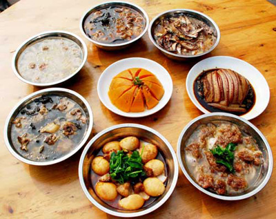 如果說靖港的吃名聞遐邇,有口皆碑,那么,八大碗則是靖港吃之翹楚,也是古鎮(zhèn)人引以為榮的傳統(tǒng)名牌。從前靖港街上數(shù)十家有名餐館,都把八大碗當(dāng)作各自的招牌菜,各餐館的廚師也都是潛心研習(xí),精益求精,把烹制出高水平的八大碗當(dāng)作看家本領(lǐng)。曾經(jīng)繁榮昌盛的“小漢口”靖港,那些停船上岸的船夫,載貨而來的生意人以及慕名而來的浪人,首先就得進(jìn)餐館吃八大碗,飽其饞吻,享其口福,乃至為了貪吃八大碗而“船到靖港口,順風(fēng)也不走。”而靖港街上的紅白喜事,也是非八大碗不成宴席。