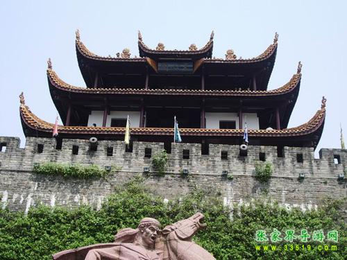 作為楚漢名城,長沙2000多年前就有寬厚的夯土城垣。明初悉改石基磚砌,外繞護城河。辛亥革命后拆城墻修環(huán)城公路,僅地勢最高的天心閣一段作為勝跡保留。時人有聯(lián)曰:“閣上九霄迎日月,城留一角看江山”。這段古城墻現(xiàn)長387.8米,高13.4米,頂面寬6.1米。分內(nèi)外兩城,外城又筑南北兩月城,內(nèi)有藏兵、炮等,并留清代鐵炮4門。城墻上尚存的斑斑彈痕,向人們訴說著城墻下的一段悲壯歲月:1852年9月10日,太平軍抵長沙南門外。西王蕭朝貴身先士卒,躍馬揮劍,在前沿指揮攻城,不幸于9月12日中炮犧牲。以此為背景,《太平軍魂》群像雕塑1993年10月在天心閣古城墻下揭幕,向世界展示了一曲農(nóng)民革命戰(zhàn)爭的悲壯頌歌。