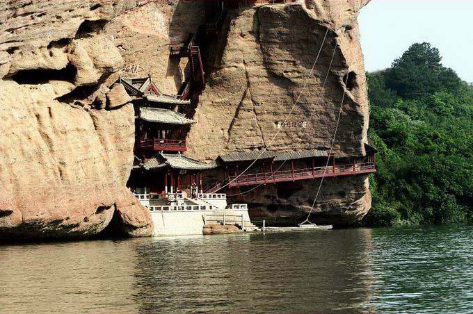 水巖在旱仙巖北面,靠上清河兩岸,因臨水而名,以碧水丹山而聞名遐邇,主體在西岸。要主景點(diǎn)有古棧道遺址、飛云閣、棋盤石、“仙女獻(xiàn)花”、仙梳石、金鐘峰、仙勺石、雌雄石等。怪石奇巖,滿山紛陳,隨處是景,目不暇接。從龍虎山莊附近乘船行不遠(yuǎn),對(duì)岸即是水巖,只見(jiàn)崖壁貼岸,陡立如屏,古樹橫生,藤蔓垂掛,山崖上古棧道遺址依然存在。在崖壁上有許多名人題刻,如“玉壁凌空”、“半天仙跡”、“神仙可接”等。至一峽口上岸,左側(cè)即絕壁獨(dú)立的“仙女獻(xiàn)花”。沿山徑上山,一路美景不斷。對(duì)岸亦是高峰聳立河邊,上清河蜿蜒中間,青山碧水,幽景迷人。