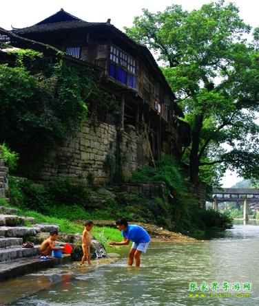 民宅多為吊腳木樓,依山傍水而建,臨河者倒影澄潭如水中街市,依山者雄峙高崖似空中樓閣。兩條河潔凈透亮,其中小河尤為美麗,青山夾岸,綠水長(zhǎng)流,河畔蓼紅芷白,桂馥蘭芳,素有“香溪”之稱。其水盡來(lái)自溶洞,距街三里之內(nèi),就有魷魚(yú)洞、犀牛洞、王家洞、向家洞幾股洞泉和一個(gè)叫“雞屎潭”的溫泉。 “雞屎潭”來(lái)有濃重的硫磺味,水溫如沸,除污力極強(qiáng),根本不需肥皂便能將汗?jié)n洗得干干凈凈,并能醫(yī)治瘡疥,維護(hù)皮膚健康。河中多魷魚(yú),肉嫩且肥,立冬前盡逆水潛入溶洞起冬,立夏前兩三天則成群結(jié)隊(duì)隨夏汛而出,鄉(xiāng)人在洞口安上網(wǎng)壕,只需“守株待兔”,便能得到豐盛的收獲。在20世紀(jì)70年代以前,有時(shí)每天可得幾百斤。 小河灘多流急,是漂流的極佳去處。