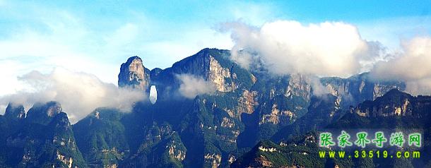 天門(mén)洞位于天門(mén)山山體的中上部,是世界上最高海拔的天然穿山溶洞,海拔1300米 ,其高131.5米,寬57米 ,深60米。它南北對(duì)開(kāi)于千尋素壁之上,扶搖而通天,似明鏡似天門(mén)鑲嵌于蔚蔚天幕之上,終年吞云吐霧,蔚為壯觀中更加神秘莫測(cè)。“天門(mén)洞開(kāi)云氣通,江東峨眉皆下風(fēng)”元朝的著名詩(shī)人張兌曾這樣贊嘆,磅礴的氣勢(shì)由此可見(jiàn)。1700多年來(lái),這一道奇絕天下的勝景吸引著無(wú)數(shù)的探訪者趨之若騖。特別是在1999年,世界特技飛行大師架機(jī)穿越天門(mén)洞,在全球引發(fā)了轟動(dòng)效應(yīng),收看現(xiàn)場(chǎng)直播的觀眾達(dá)到8億之多。