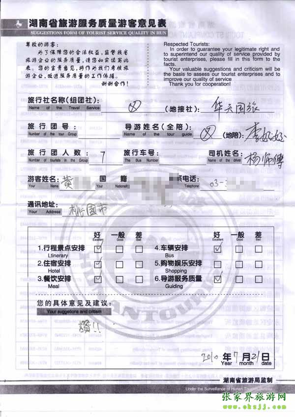 2010年7月21日臺灣黃小姐一行7位旅游質(zhì)量反饋