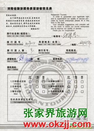 2009年11月14日袁先生一行9人旅游接待質(zhì)量反饋單: