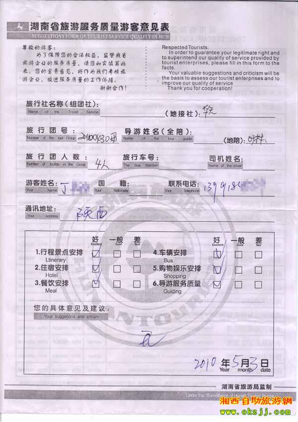 2010年5月3日陜西丁先生一行4位旅游質(zhì)量反饋