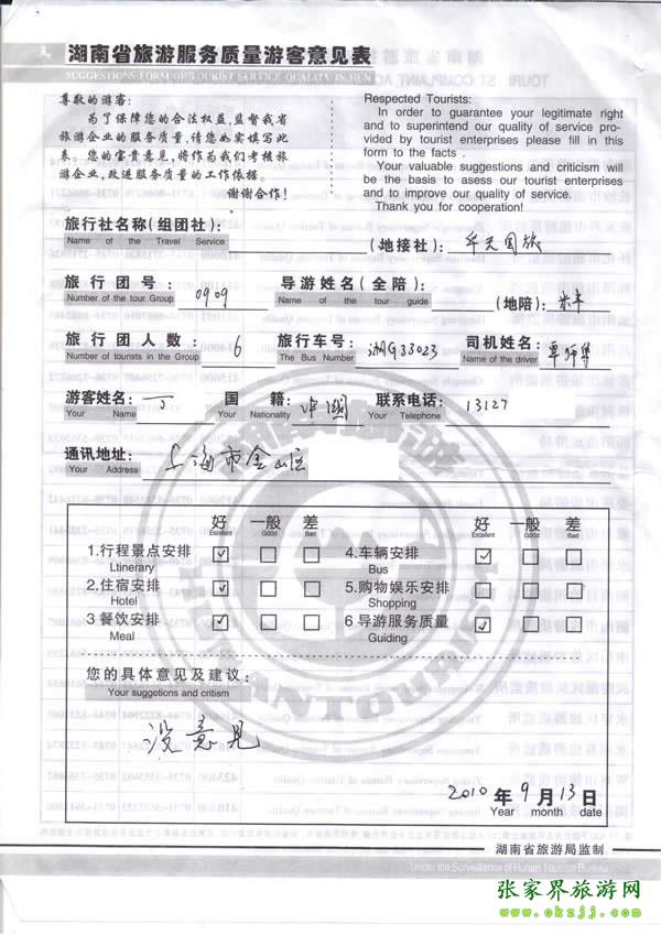 2010年9月9日上海丁先生/女士 給米豐導(dǎo)游好評